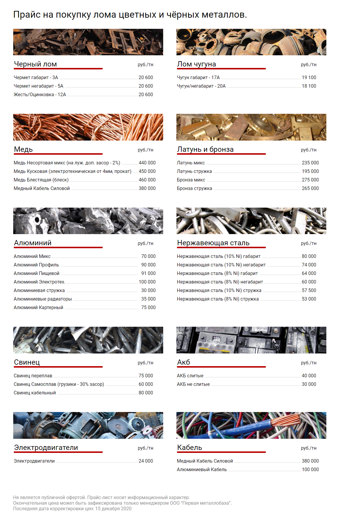 Не является публичной офертой. Прайс-лист носит информационный характер. Окончательная цена может быть зафиксирована только менеджером ООО “Первая Металлобаза”. Последняя дата корректировки цен: 15 декабря 2020